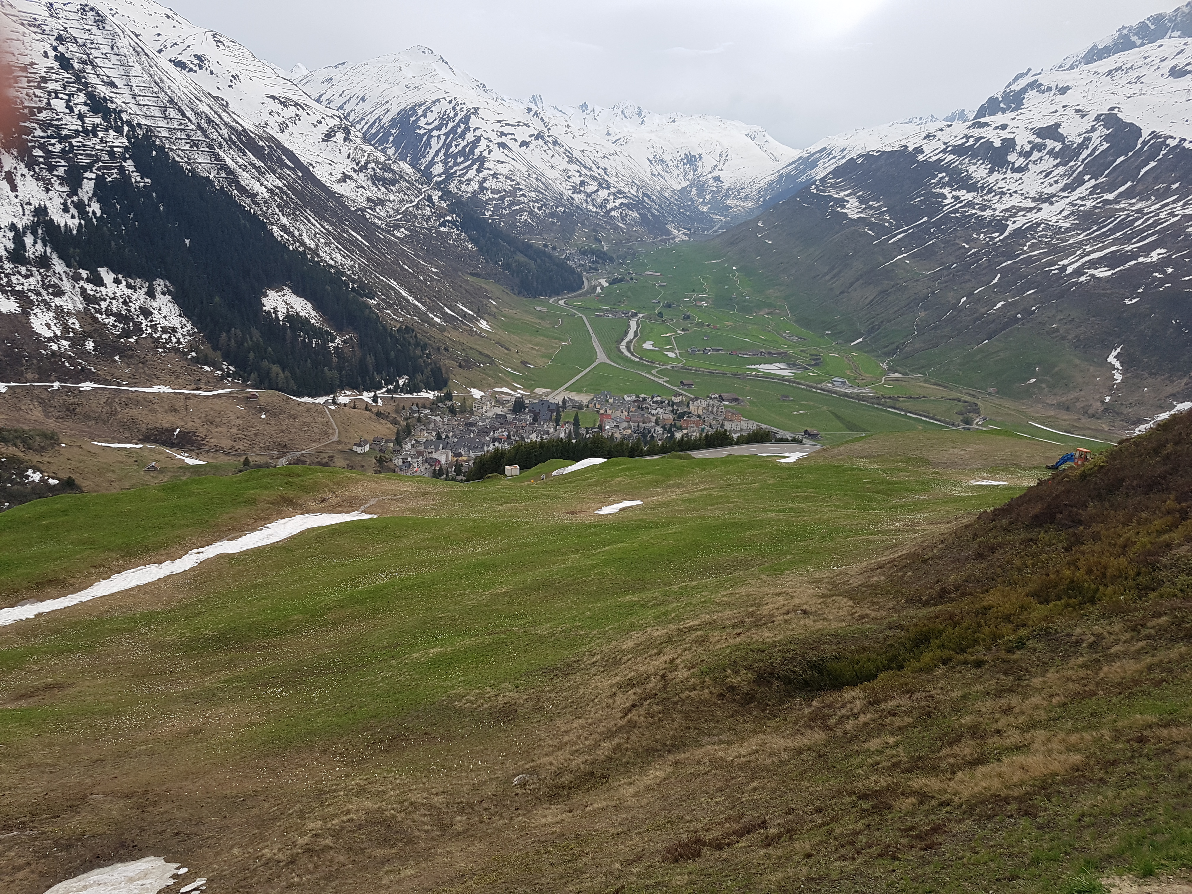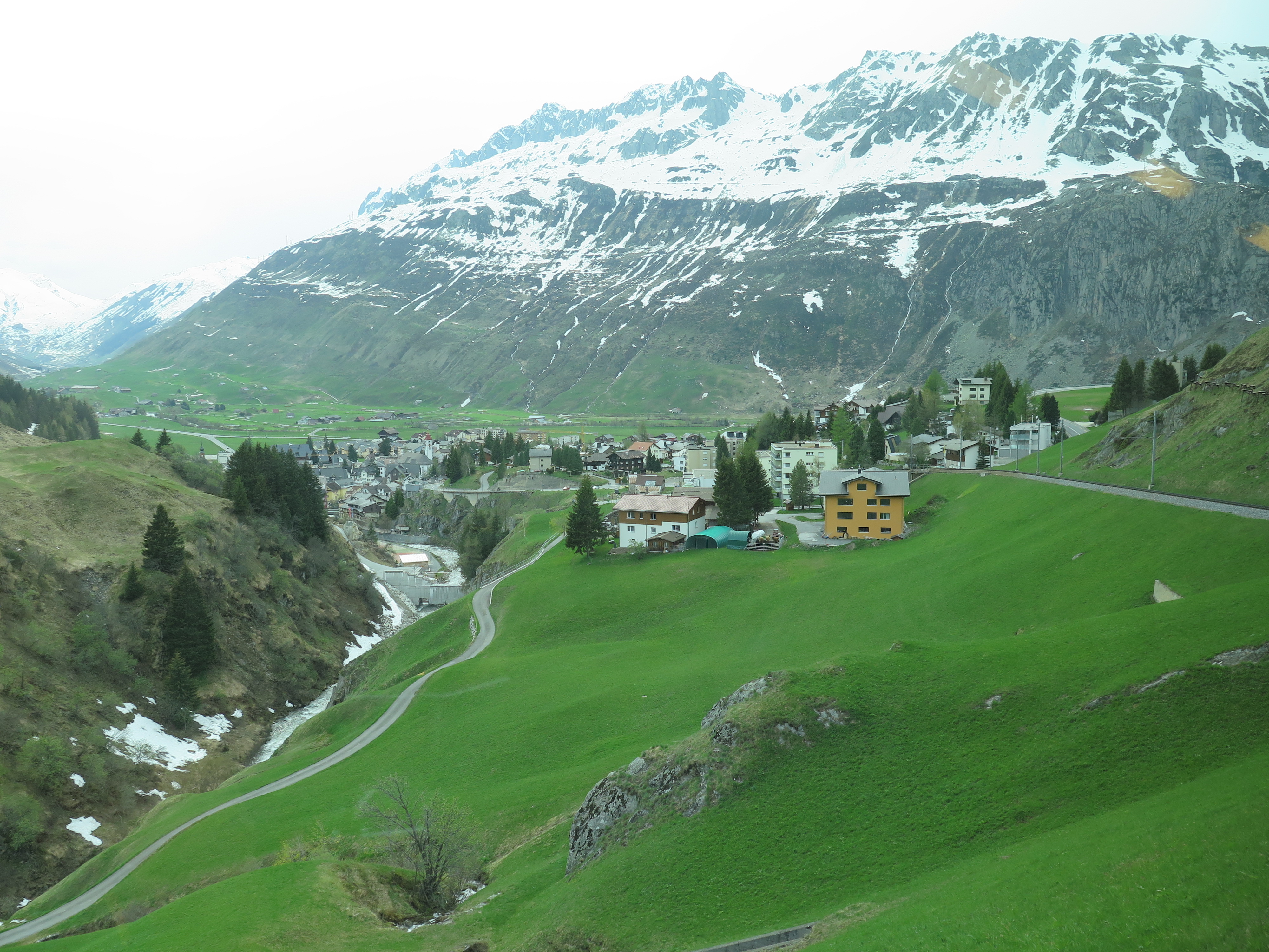 Etter noen mil ankom vi byen Chur hvor vi skulle ta toget over Oberalppass og de siste milene opp til Andermatt. Her er så bratt stigning at vi ikke ville oss så «vondt» å tråkke opp. Passet er åpent fra mai til november, og jernbanen går nokså parallelt med veien. Her lå fortsatt masse snø. Skummelt nok å ta jernbanen da det er nokså rett opp og rett ned.